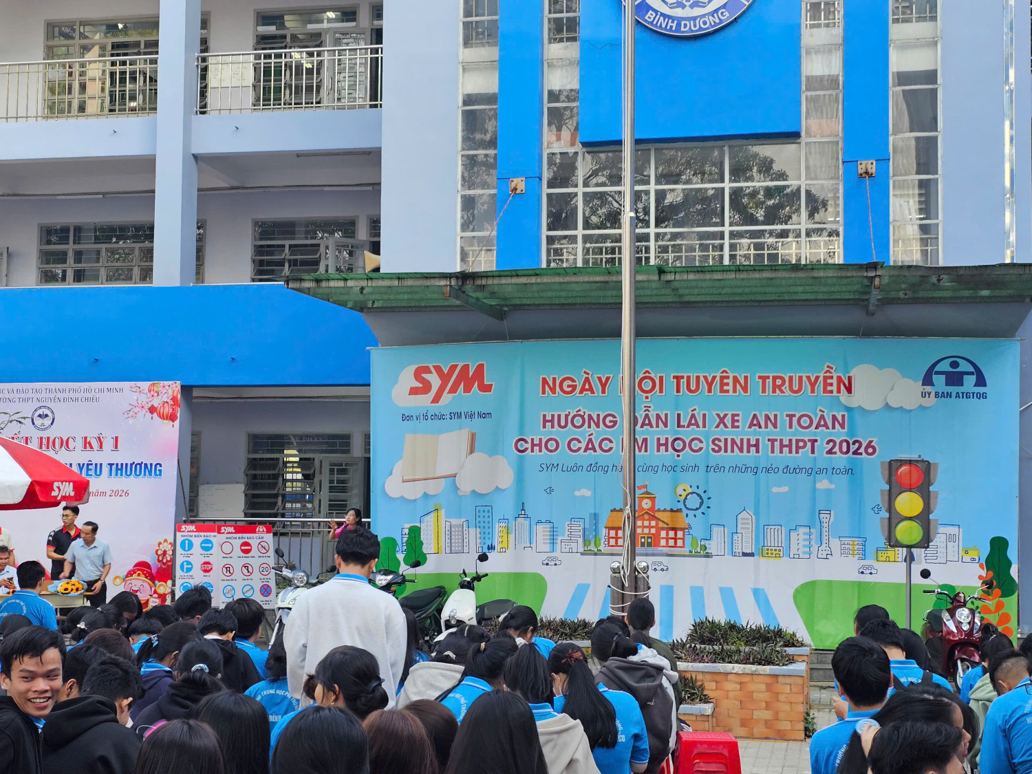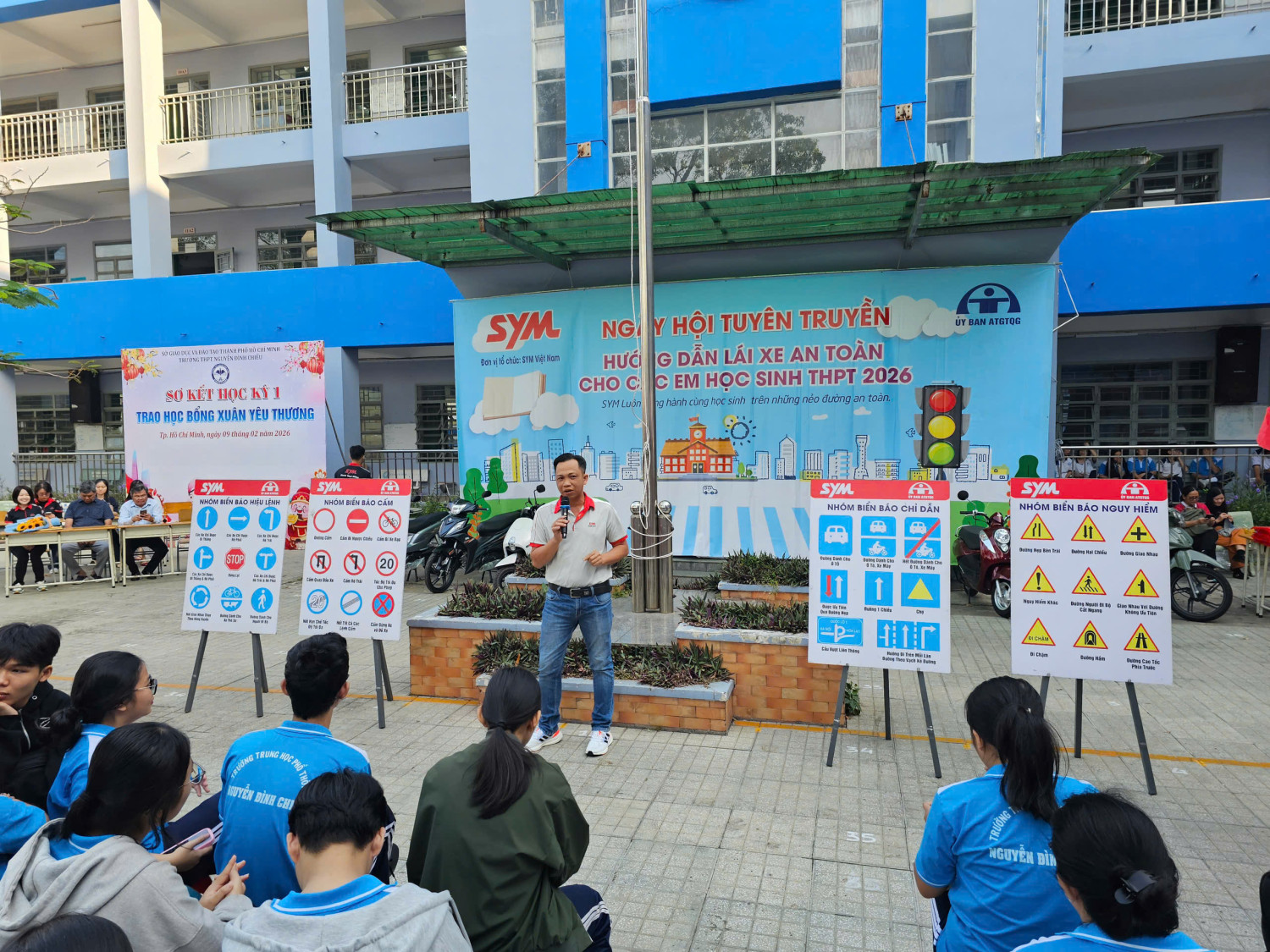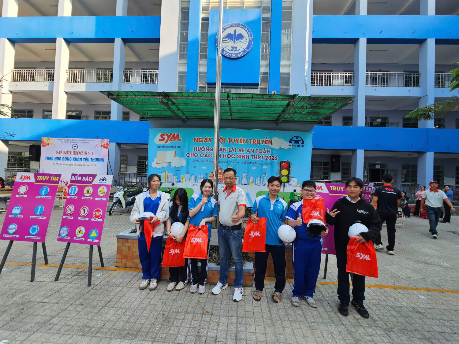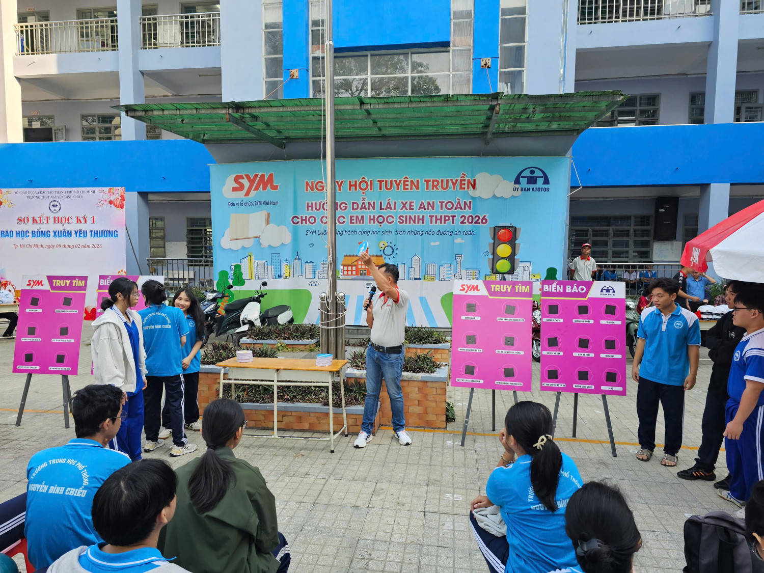 Chương trình diễn ra từ 07 giờ 00 đến 11 giờ 00 với sự tham gia của đại diện Công ty SYM Việt Nam (VMEP), Ban Giám hiệu nhà trường, quý thầy cô giáo cùng đông đảo học sinh toàn trường. Đây là hoạt động có ý nghĩa thiết thực nhằm trang bị cho học sinh những kiến thức, kỹ năng cơ bản về an toàn giao thông, đặc biệt là ý thức chấp hành pháp luật khi tham gia giao thông, góp phần xây dựng văn hóa giao thông học đường an toàn, văn minh.