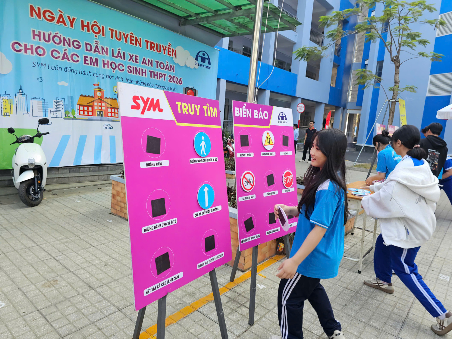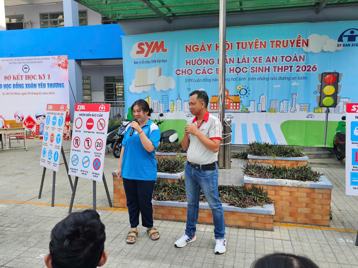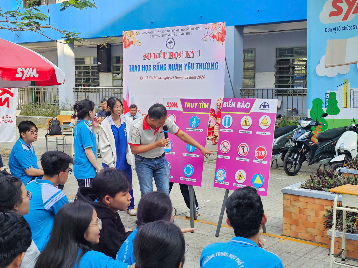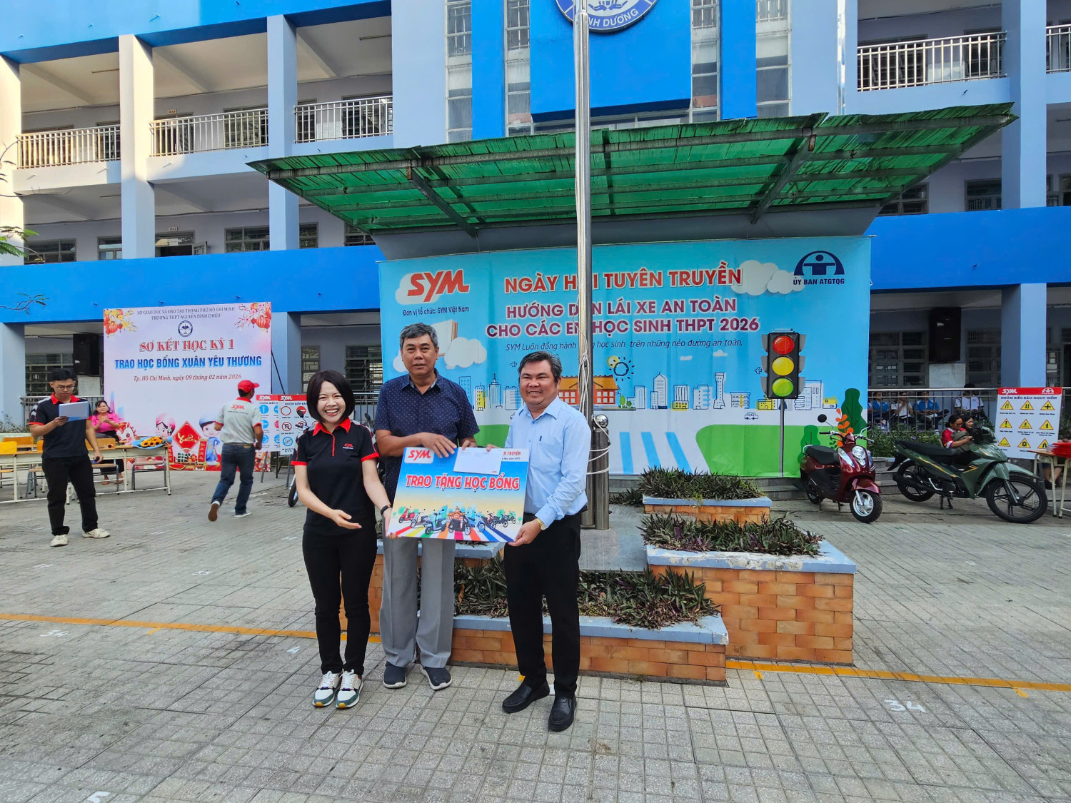Chương trình diễn ra từ 07 giờ 00 đến 11 giờ 00 với sự tham gia của đại diện Công ty SYM Việt Nam (VMEP), Ban Giám hiệu nhà trường, quý thầy cô giáo cùng đông đảo học sinh toàn trường. Đây là hoạt động có ý nghĩa thiết thực nhằm trang bị cho học sinh những kiến thức, kỹ năng cơ bản về an toàn giao thông, đặc biệt là ý thức chấp hành pháp luật khi tham gia giao thông, góp phần xây dựng văn hóa giao thông học đường an toàn, văn minh.